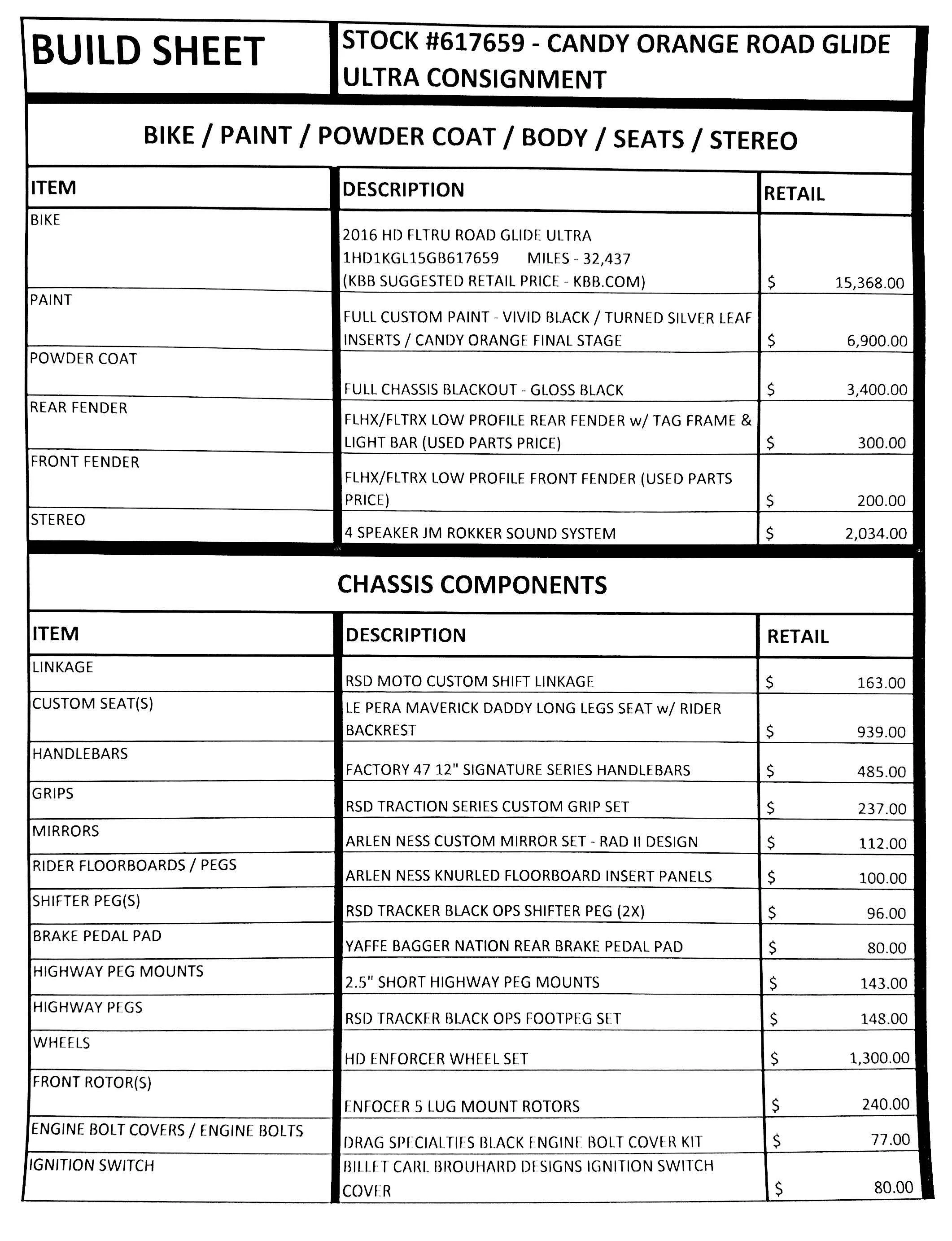If you love our bikes, however you just cant bite off $60-$70k for one. We hear this story a lot and we understand. If that sounds like your situation, then this bike may be for you! This bike was previously built by our team in 2015. It’s current consigning owner originally purchased it from our custom built inventory in November of 2016 and has ridden it since. He has decided to upgrade to the latest model Road Glide so it is up for sale and It is now ready for someone else to enjoy it! This bike has 32,437 miles on it. It was originally built with 6,700 miles on its odometer. It current owner has put all of the miles on it since it was built. It has been garage kept and professionally cleaned and polished. All services are up to date. All you need to do is jump on this bike and ride it! The oil is fresh and the tires have approximately 50% of their tread left.