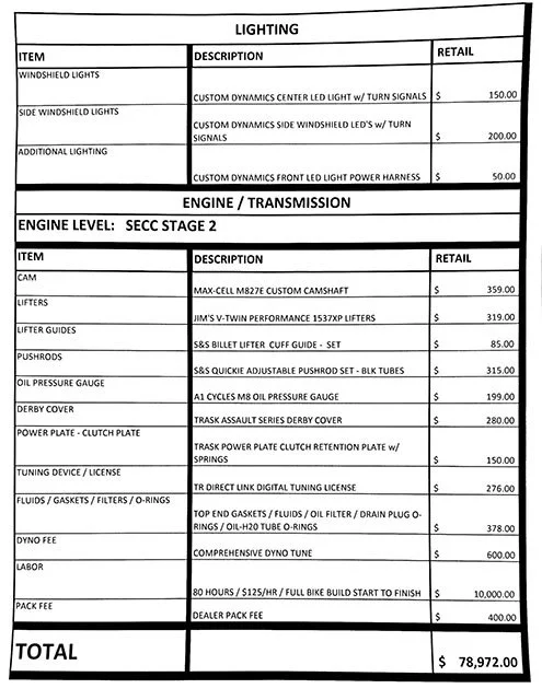 The entire build sheet is shown below. This bike is completely built in every aspect! You will absolutely love this bike! Plan on it taking an extra 5 minutes each time you fill up with gas. Why? Because everyone in the parking lot will be wanting to know where you got such a beautiful bike from! The compliments you will get while on this bike are astonishing!